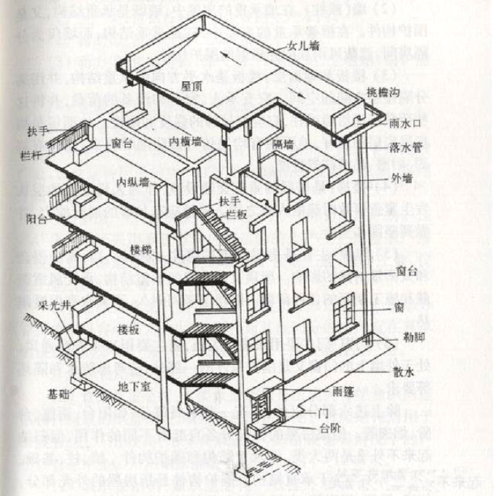 5、屋顶:主要是房屋的围护构件,抵抗风、雨、雪的侵袭和太阳辐射热的影响。屋顶又是房屋的承重结构,承受风雪荷载和施工期间的各种荷载。屋顶应坚固耐久、不漏水和保暖隔热。